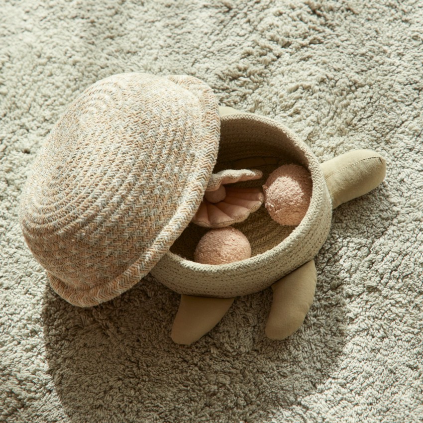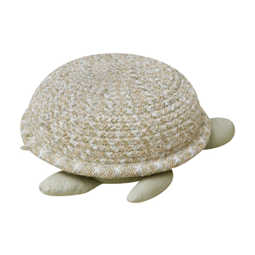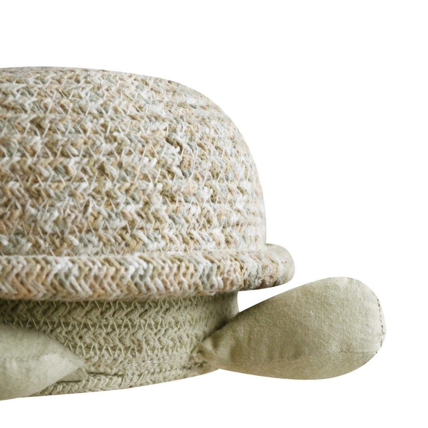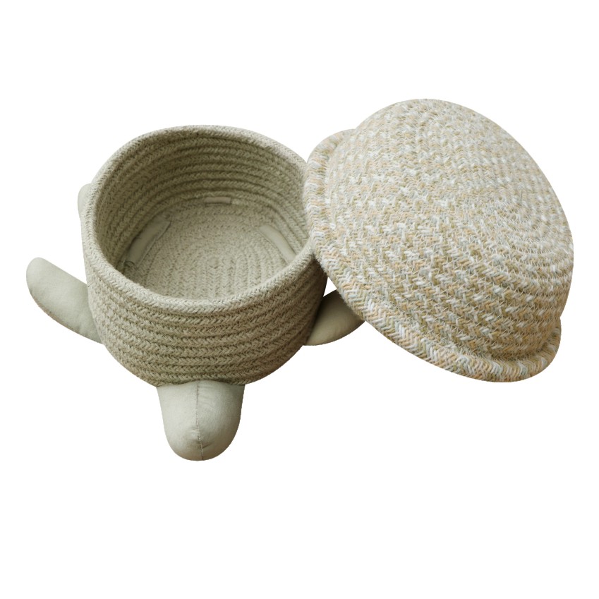 Der Korb Baby-Schildkröte bietet Platz zur Aufbewahrung kleiner Schätze in dem sehr dekorativen kleinen Korb mit Deckel. Die Baby-Schildkröte wird aus geflochtenen Schnüren in Handarbeit hergestellt. Die stabilen Schnüre bestehen aus Fasern von recycelten PET-Flaschen und Baumwolle. Die am Korb befestigten Beine und der Kopf einer Meeresschildkröte sind aus olivgrünem Baumwollstoff angefertigt.