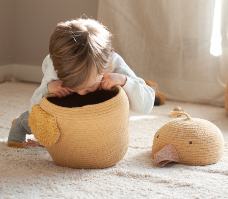 Ausräumen - Spielen - Einräumen ... mit dem runden Korb Charlie das Küken macht Spielen, Sammeln und Ordnen sogar Spass. In dem robusten Korb mit Deckel sind kleine Stofftiere, Bälle oder andere Spielsachen gut aufbewahrt. Der stabile Korb Charlie das Küken wird in Handarbeit hergestellt. Das für den Korb verwendete Flechtmaterial besteht aus 67% Baumwolle und 33% Fasern aus recycelten PET-Flaschen.