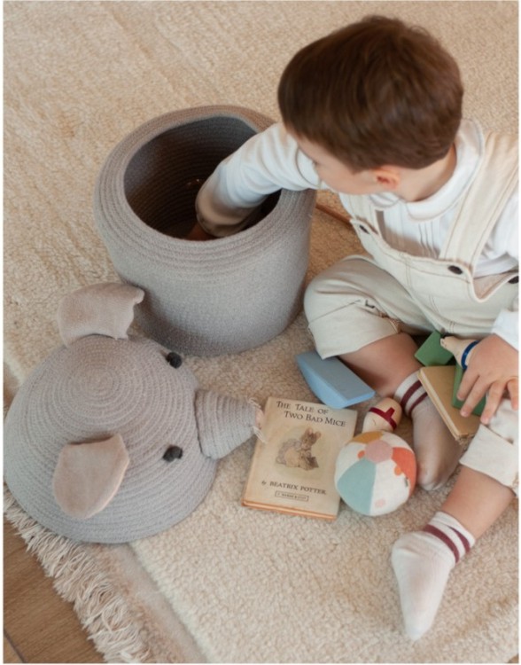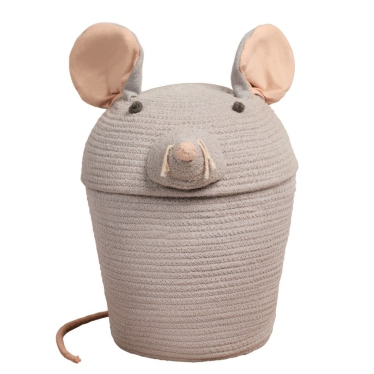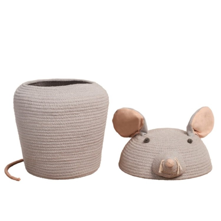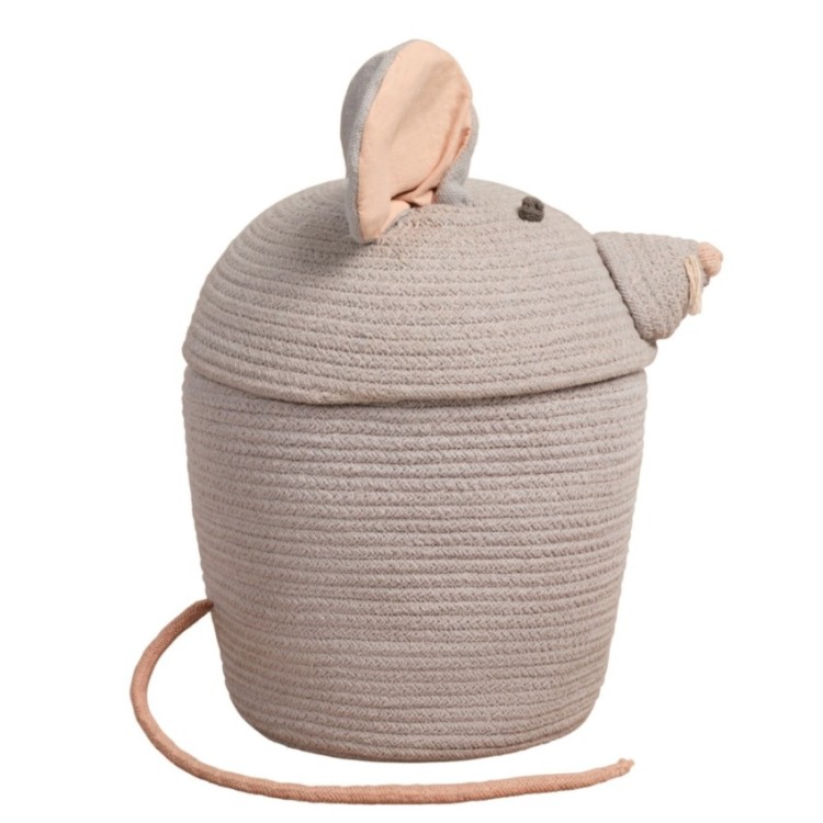 Der perlgraue Korb Renata the Rat wird mit sehr stabilen Schnüren in Handfertigung hergestellt. Die am Korbdeckel befestigten runden Ohren und die kleine Spitznase ergeben zusammen mit dem rosafarbenen Rattenschwanz am Korb ein witziges Design für diese dekorative Aufbewahrungsmöglichkeit. Der Korb Renata the Rat kommt aus nachhaltiger Produktion und besteht aus 67% Baumwolle und 33% Fasern aus recycelten PET-Flaschen.