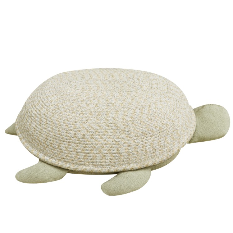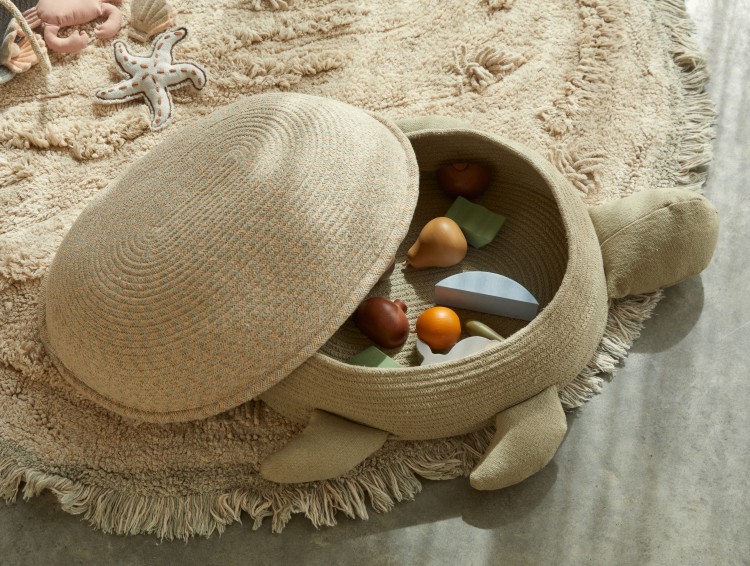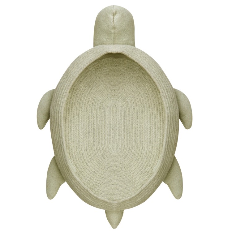 In dem Korb Schildkröte sind kleine Dinge wie Spielbausteine, Modellautos gut aufgehoben. Der kreativ gestaltete Korb mit Deckel wird aus geflochtenen Schnüren in Handarbeit hergestellt. Die stabilen Schnüre bestehen aus Fasern von recycelten PET-Flaschen und Baumwolle. Am Korb sind Schildkrötenbeine und ein Schildkrötenkopf befestig, die aus olivgrünem Baumwollstoff angefertigt und mit Polyesterfasern gefüllt sind.