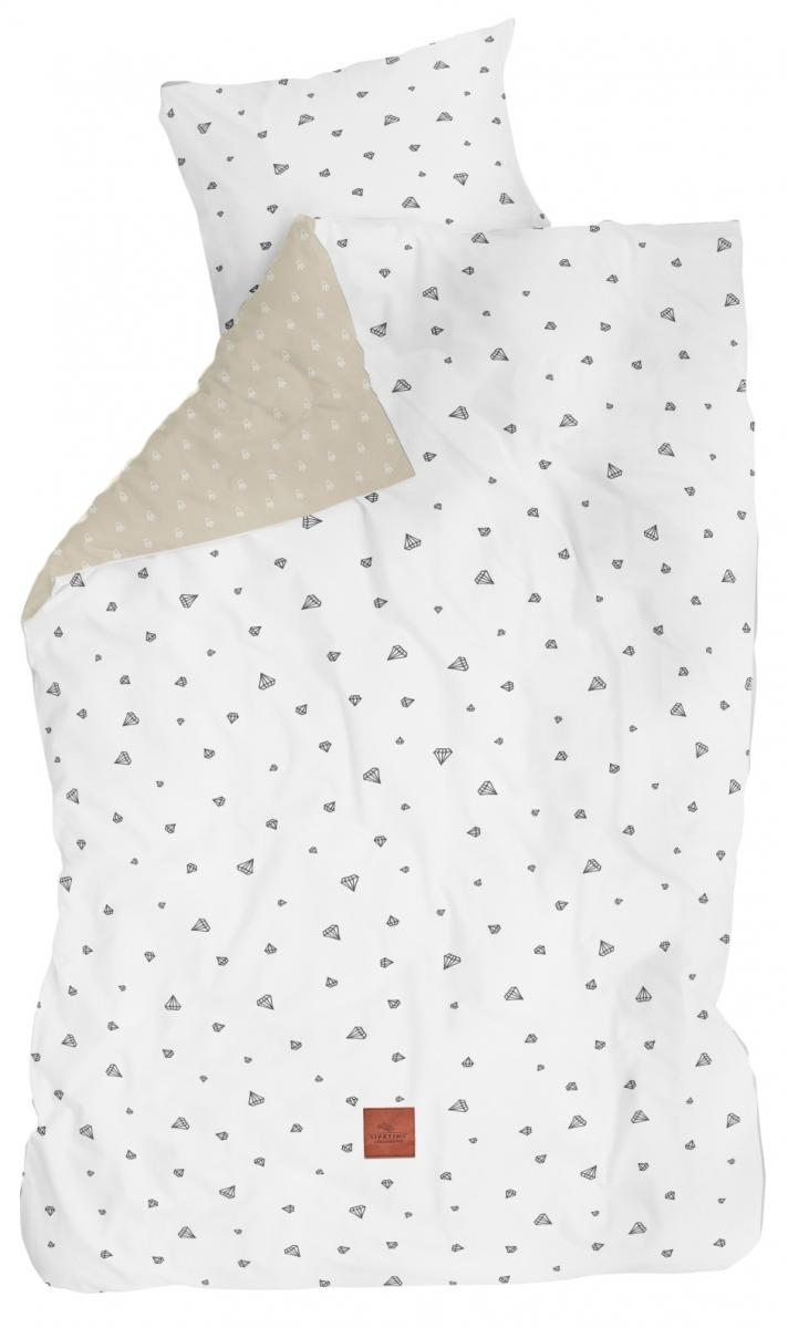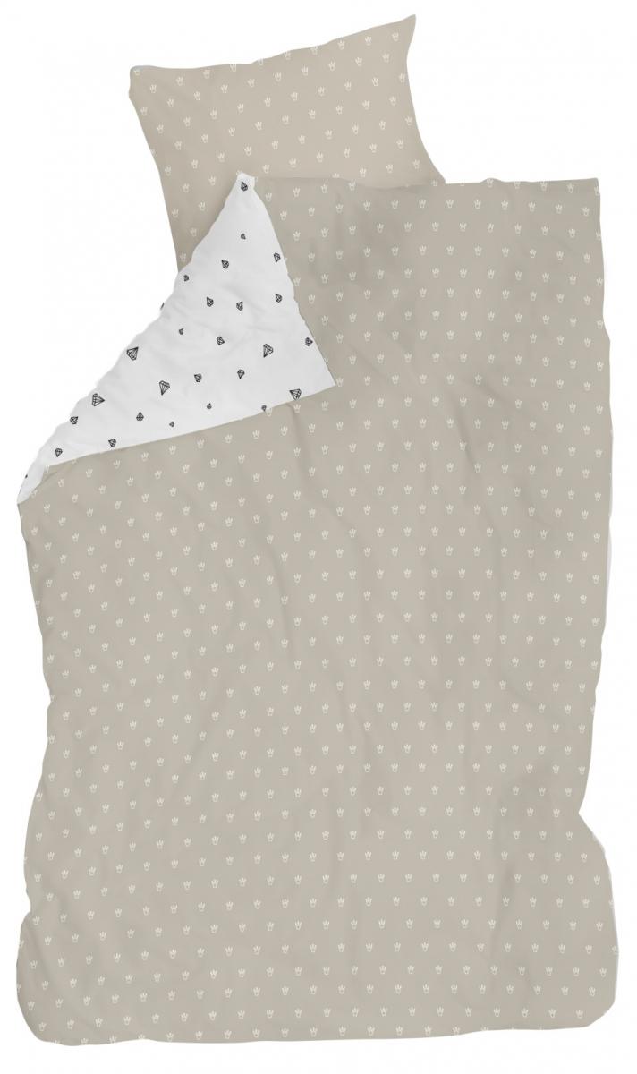Die Bettwäsche Crowns & Diamonds für Jungen und Mädchen wird aus Baumwollstoff genäht und besteht aus je einem Bezug für Bettdecke und Kopfkissen. Auf der weissen Vorderseite von Kissen- und Deckenbezug sind kleine Diamanten aufgedruckt. Die Rückseite hat die Grundfarbe Beige mit vielen kleinen Kronen. So ermöglicht die Bettwäsche durch einfaches Wenden auf das andere Design zusätzliche Abwechslung. Für einen bequemen Bettwäschewechsel sind die Bezüge mit Reissverschluss ausgestattet. Die Bettwäsche Crowns & Diamonds ist von OEKO-TEX® geprüft und mit dem Label OEKO-TEX® STANDARD 100 zertifiziert.