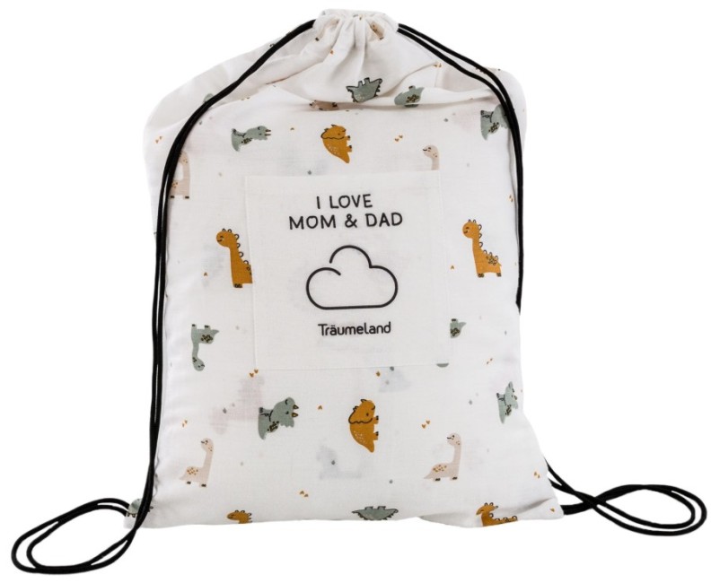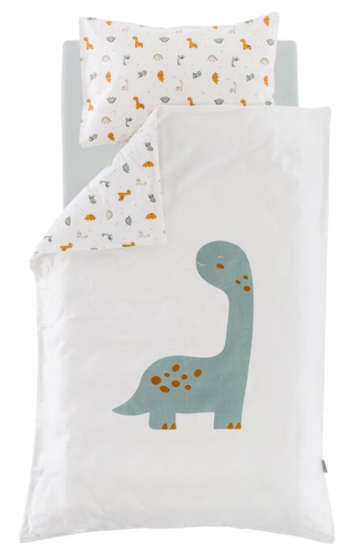 Die Bettwäsche Dinolino wird aus feingewebtem, weissen Baumwollstoff genäht. Eine Seite der Bettwäsche ist mit kleinen Dinosauriern in den Farben Orange, Zartrosa und Hellgrau bedruckt. Auf der Oberseite der Bettdecke ist ein großer Dino abgebildet. Der Kopfkissenbezug wird mit einem Hotelverschluss angefertigt und der Deckenbezug ist mit einem Reissverschluss ausgestattet. Die Bettwäsche ist in einem Turnbeutel nachhaltig verpackt, der aus Baumwollstoff mit Dinomotiven genäht ist und als Tragetasche genutzt werden kann. Die Bestandteile der Bettwäsche wurden von OEKO-TEX® kontrolliert und mit dem Label STANDARD 100 zertifiziert.