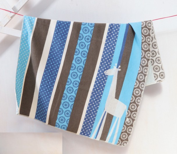 Wunderbar wärmende Kinderdecke in Blau- und Brauntönen mit breiten Musterstreifen und einer kleinen weissen Giraffe. Die Decke wird in Österreich hergestellt und besteht aus 95% Bauwolle und 5% Viskose.