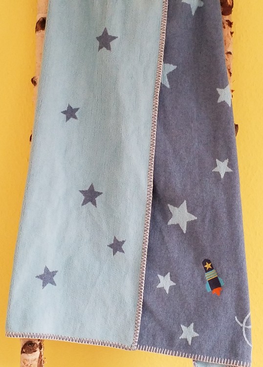 Die kuschelig weiche Decke Rakete ist auf einer Seite dunkelblau mit hellblauen Sternen und hat ein kleines aufgesticketes Raketenmotiv. Die andere Deckenseite ist hellblau mit dunkelblauen Sternen. Die Decke wird in Österreich hergestellt und besteht aus 85% Baumwolle und 15 % Polyacryl. Die Ränder sind mit einem schönen weissen Zierstich versehen.