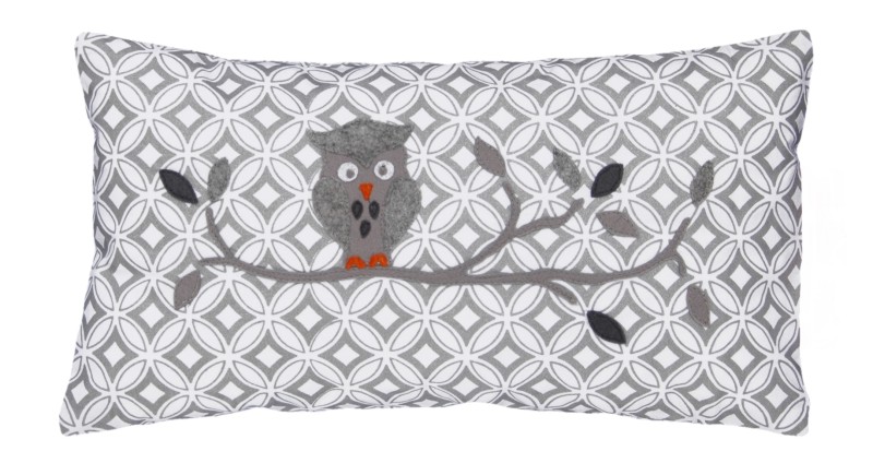 Das dekorative Kissen Waldvogel hat auf beiden Kissenseiten ein Muster aus weiss und silbergrauen Ornamenten. Auf einer Seite ist das Motiv eines Eulenvogels auf einem Zweig aus Filz aufgenäht. Der Kissenbezug ist abnehmbar und kann bei 40°C gewaschen werden.