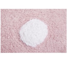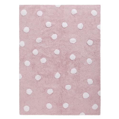 Der waschbare Baumwollteppich Polka Dots hat die Grundfarbe Hellrosa und ist großen weissen Punkten gemustert.