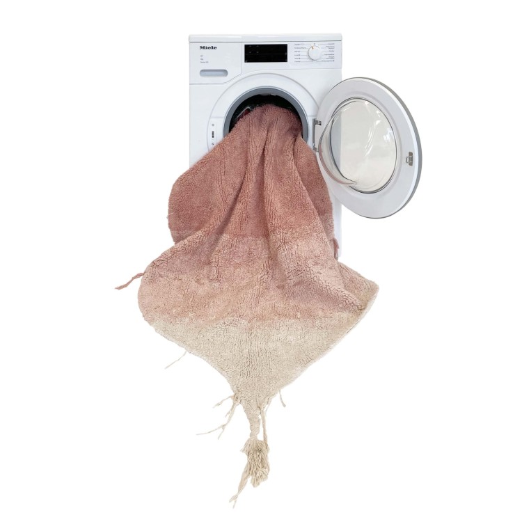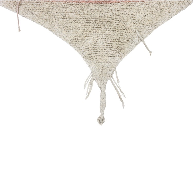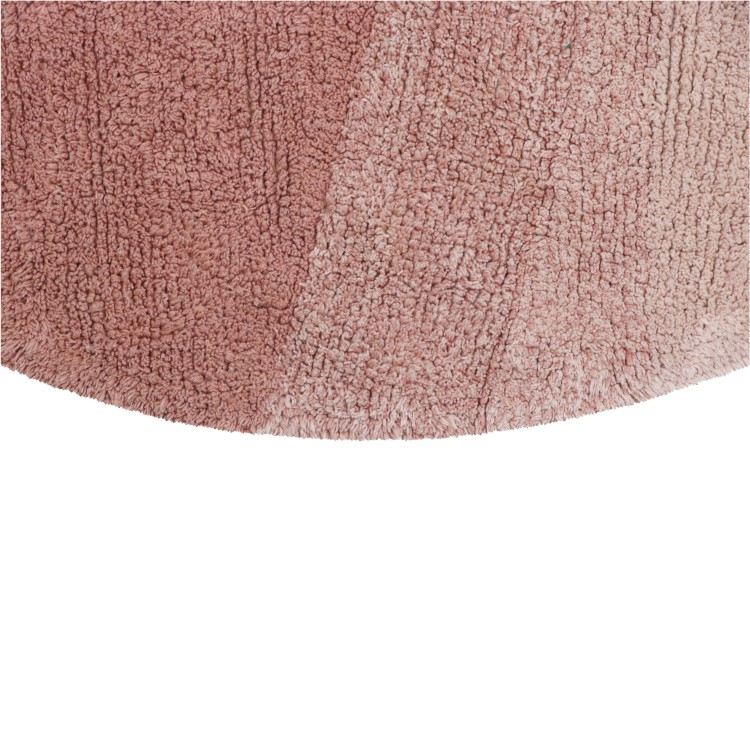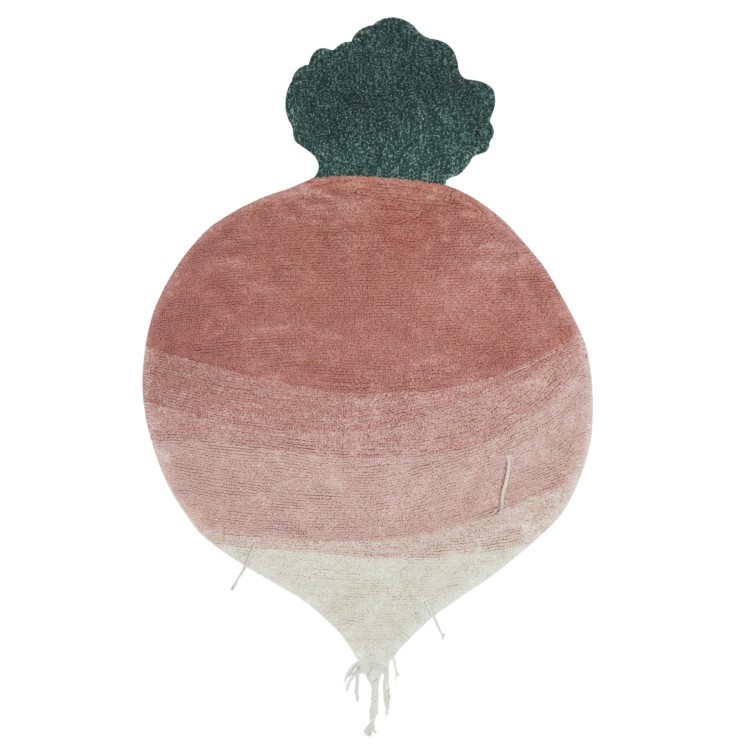 Der Teppich Ramona Rettich ist ein liebevoll, mit kleinen Details angefertigter Baumwollteppich in der Form eines Rettichs mit Blatt und Wurzel. Von den Blättern aus grünem Melange-Garn verlaufen Farbringe aus Ombré-Rosatönen über den runden Teppich bis zur naturfarbenen Wurzelspitze mit einigen Wurzelzöpfen.