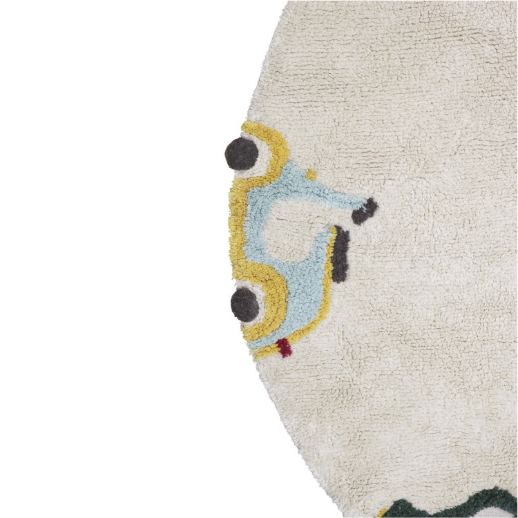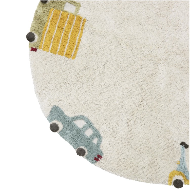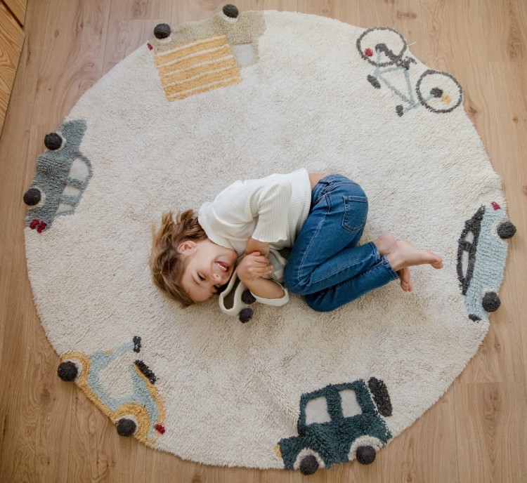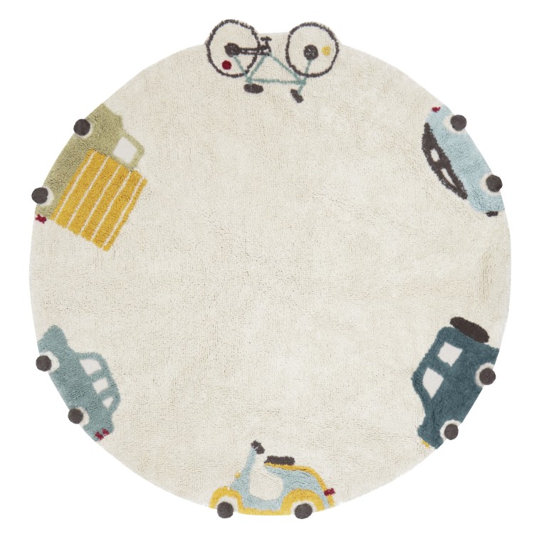 Auf dem runden Spielteppich Wheels sind ganz unterschiedliche Fahrzeuge abgebildet. Ein roter Punkt kennzeichnet den Akku-Ladeanschluss der Mobile auf dem Teppich, die elektrisch angetrieben werden können.